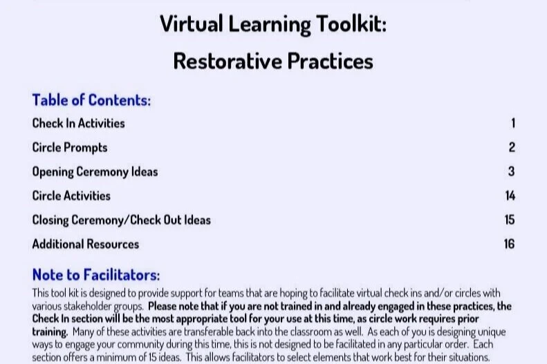 Online Advisory Resources Click Here to Access a Toolkit Created by the Affinity/OSYD Restorative Practices Expansion Click Here to View and Add to Our “Advisory Ideas For Remote Caring” Document