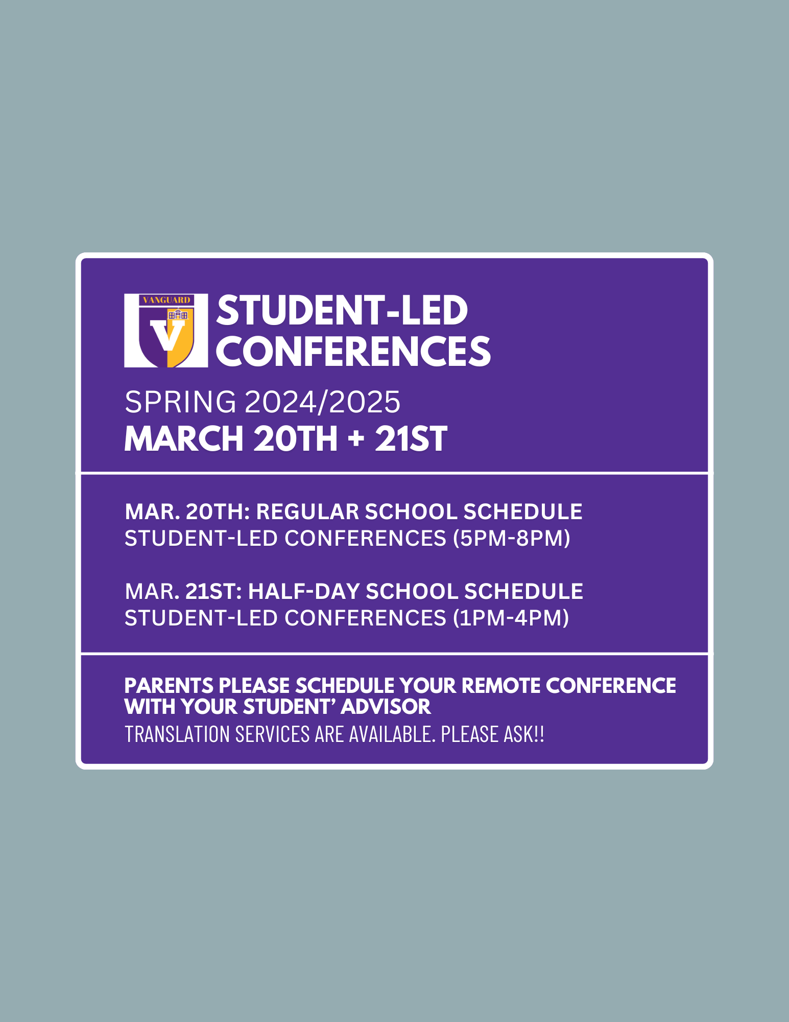 Spring Student Led Conferences are March 20th and 21st. Parents can schedule a remote conference time with your student’s advisor. Translation services are available!!